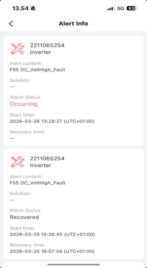 -Automatic recovery: As irradiance decreases in the evening, PV voltage falls back into the safe range, the protection clears, and the inverter resumes normal operation.