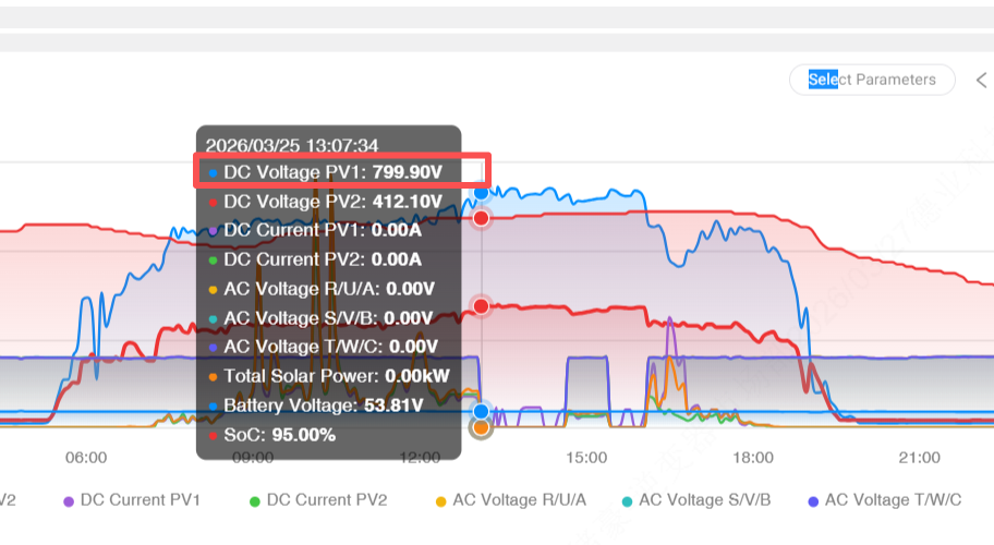 This case is typical: PV1 string series count is too high so the open‑circuit voltage reaches 799.90 V, far exceeding the inverter's allowable input. Under strong irradiance, overvoltage protection is inevitably triggered. Some cases also show imbalance between PV1 and PV2 in module type or string count, causing one string to exceed safe voltage.